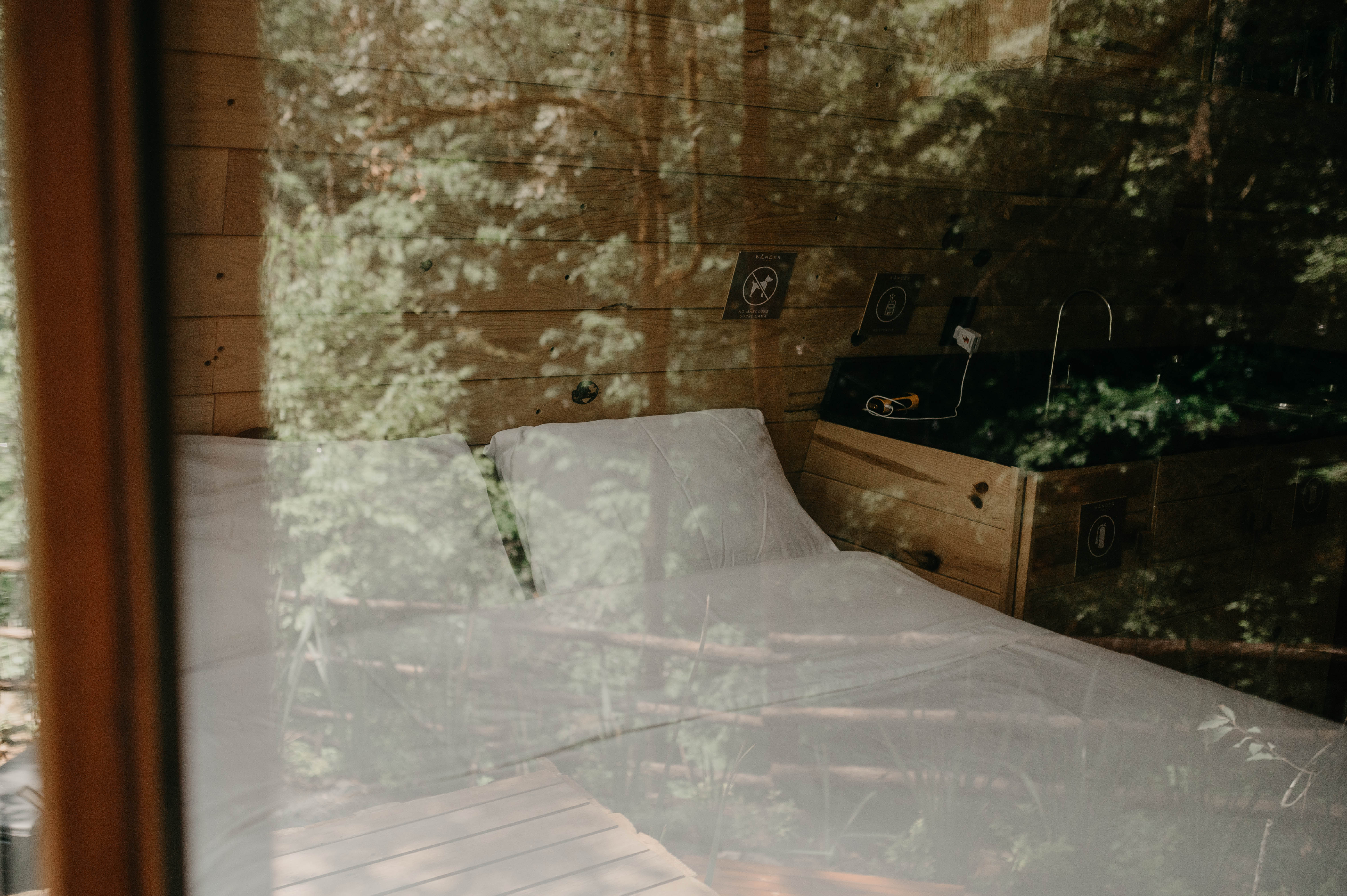 Una de nuestras nuevas 4 cabañas!! La cabaña tiene dos camas Queen con sábanas y almohadas frescas, una en un tapanco privado con vista al bosque. Ambas camas siempre están a la vista de una ventana, para que pueda despertar en los árboles.