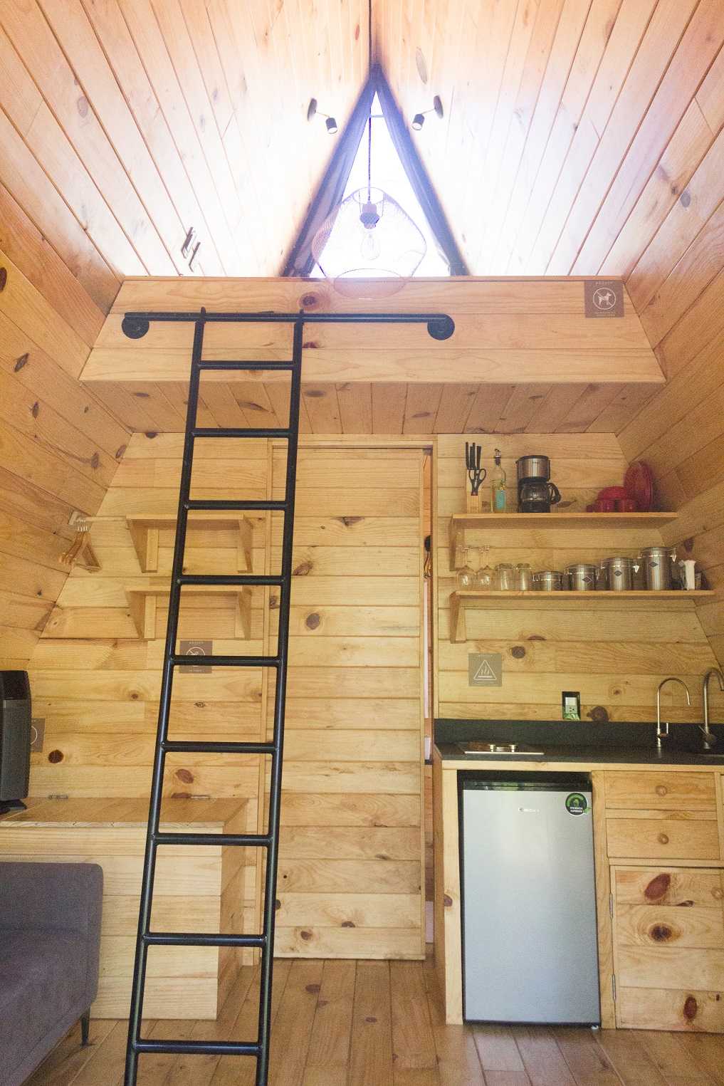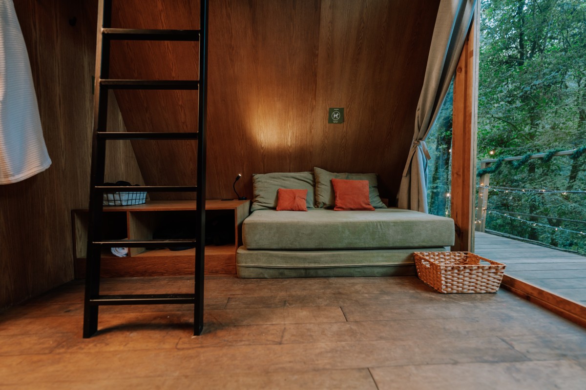 Esta cabaña cuenta con una cama tamaño Queen en un tapanco, con una ventana con una gran vista para poder despertar entre los árboles. La cabaña también cuenta con un sofá cama para hasta una persona adicional.