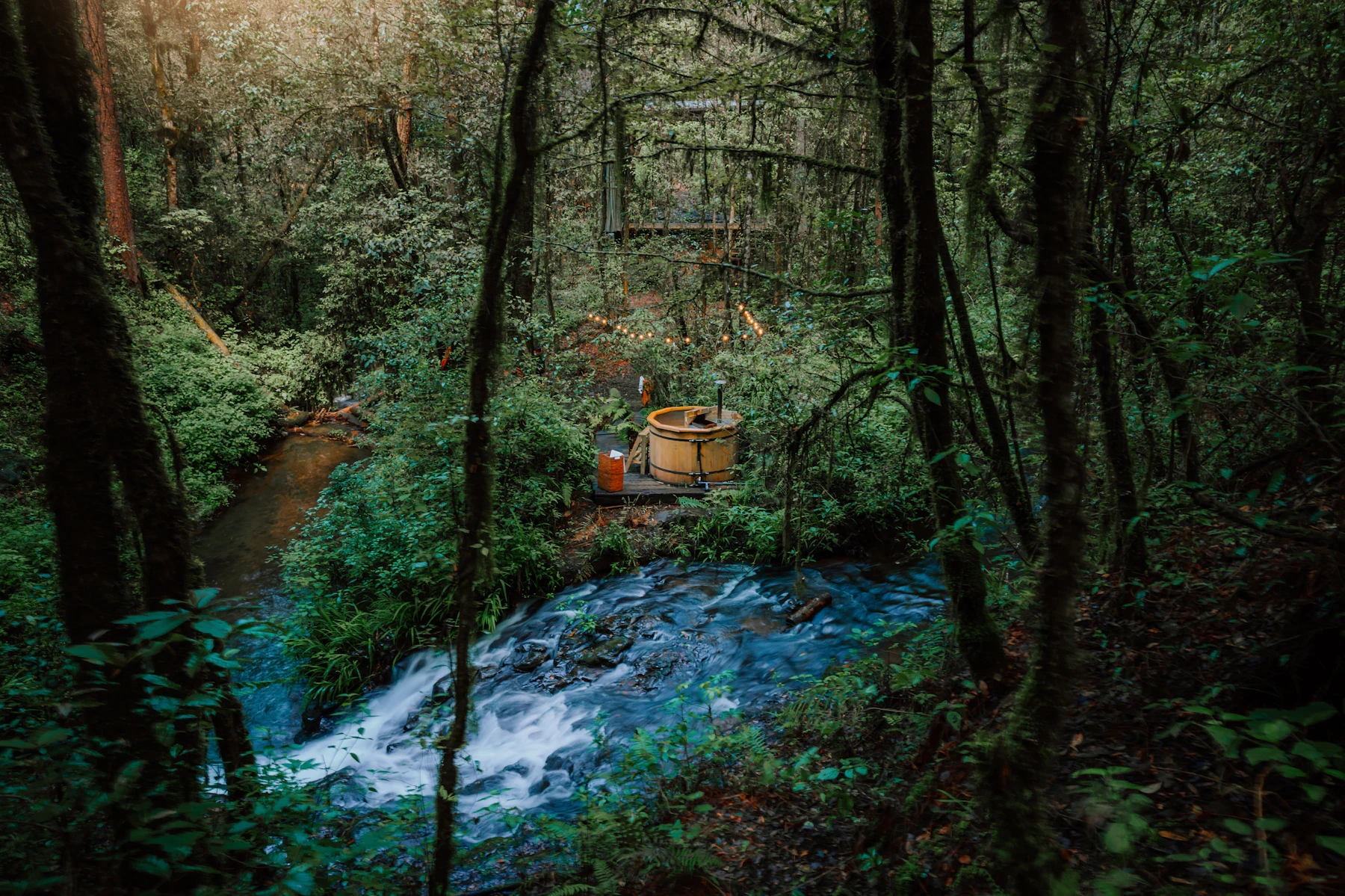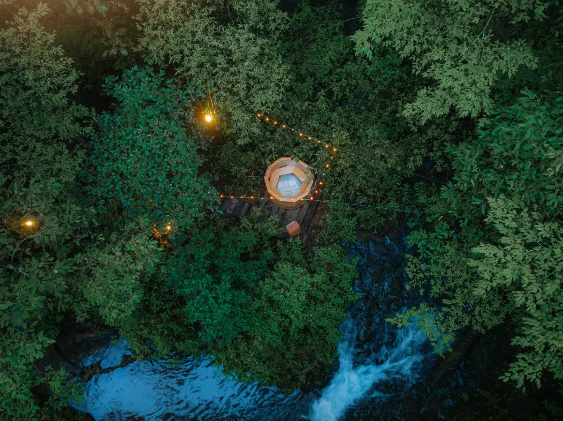 Disfruta de una hora de relajación total con tu pareja en un jacuzzi artesanal debajo de los arboles y con el sonido del rio detrás.