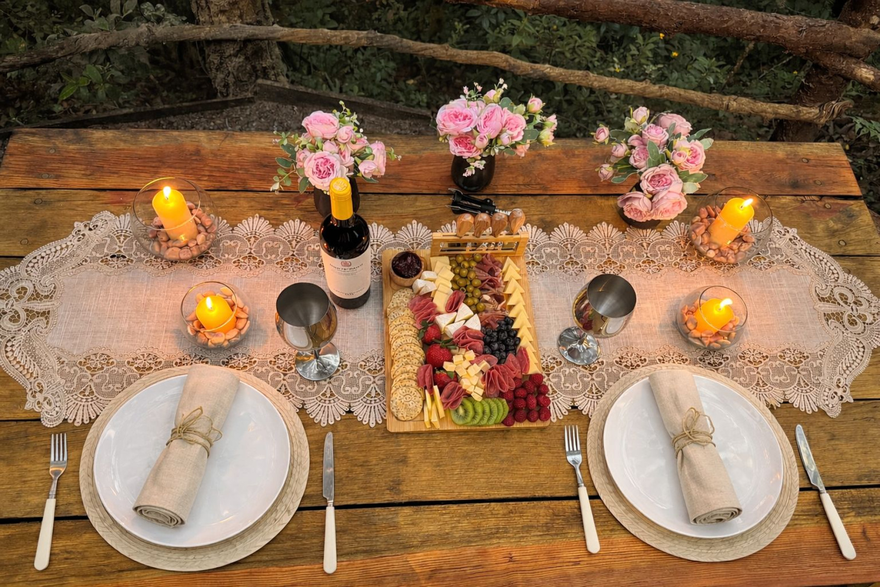 Te organizamos un evento romántico con tu pareja en tu horario preferido. Decoramos la cabaña y la mesa de picnic con velas, flores, manteles e iluminación para que disfrutes de una velada romántica debajo de los árboles. El evento incluye una botella de vino tinto de Monte Xanic y una tabla con carnes frías, 3 tipos de quesos finos, jamón serrano, salami, kiwi, frutos rojos, aceitunas y pan.